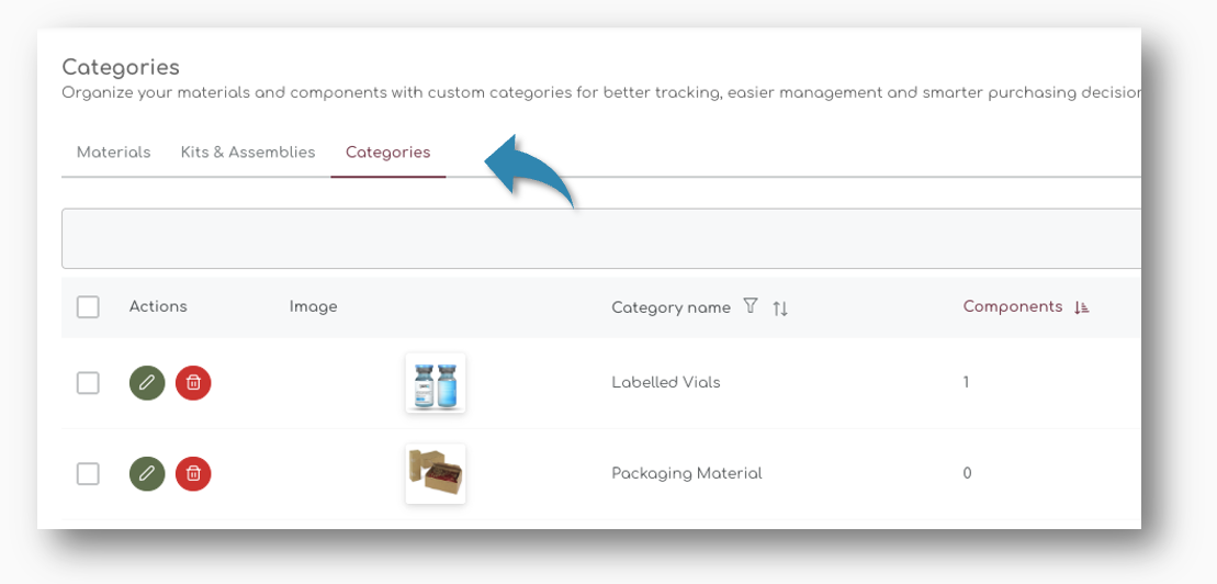 - On the Materials page, click on the "Categories" tab to switch to the Categories view.