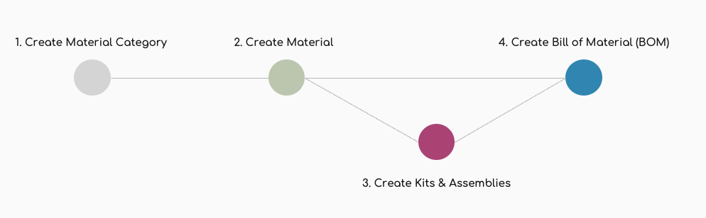 Before you can create Materials, you will have to set up a Material Category. The diagram below illustrates the order and relationship between the different elements. You can create a Bill of Material with only materials, but also with combinations of Materials and Kits or Assemblies.