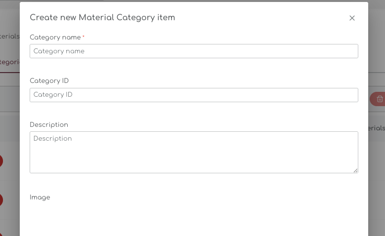 Before you can create a new material, you have to assign a category to the material. When you have set up the categories for materials in your store, you can select the Category from the dropdown list: