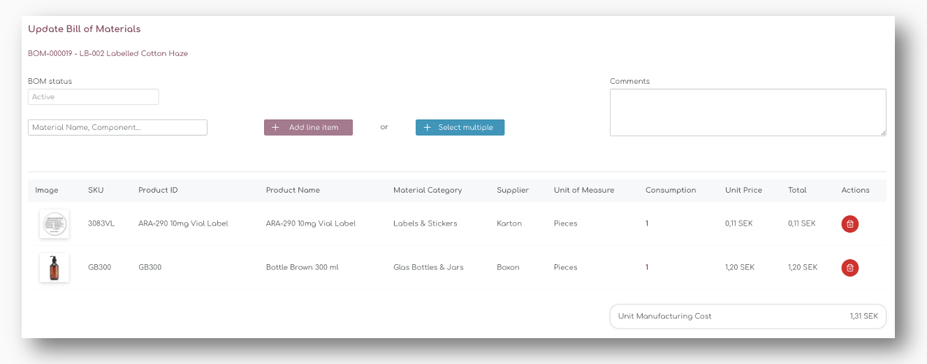 The Line Items in the BOM show the general information of the Kit, such as product/material name, supplier and unit of measure.
