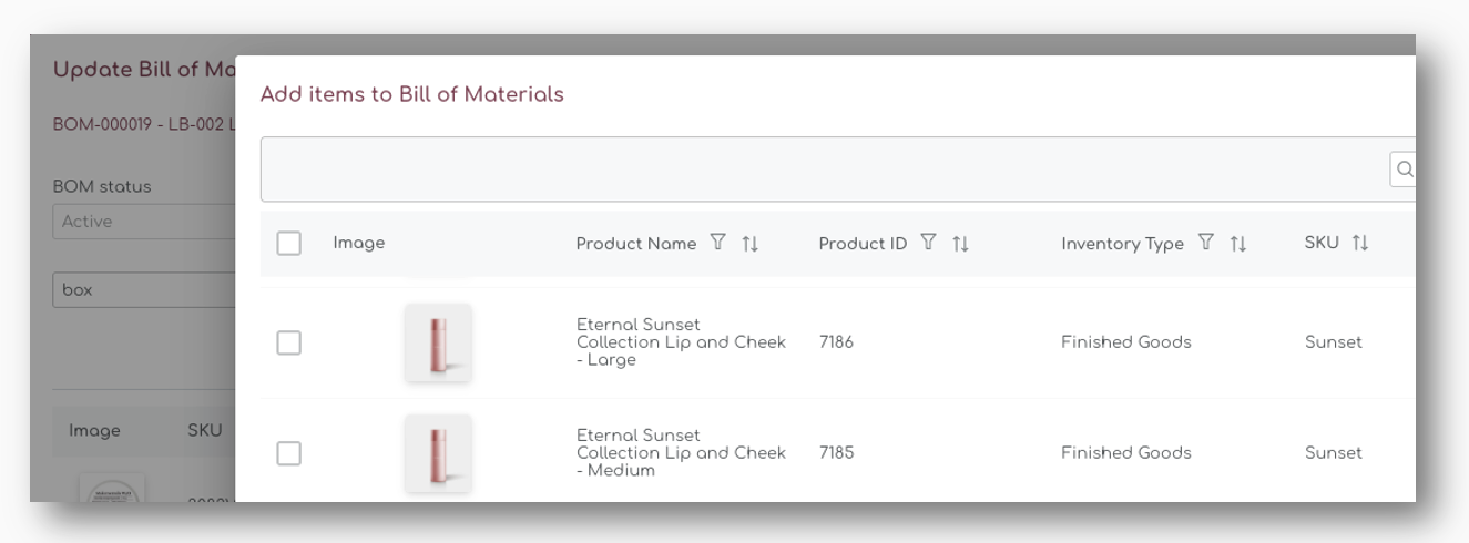 Only Materials will appear in this search. If you want to add a Finished Goods, or other Kits / Assemblies, you can use the "Select Multiple" instead: