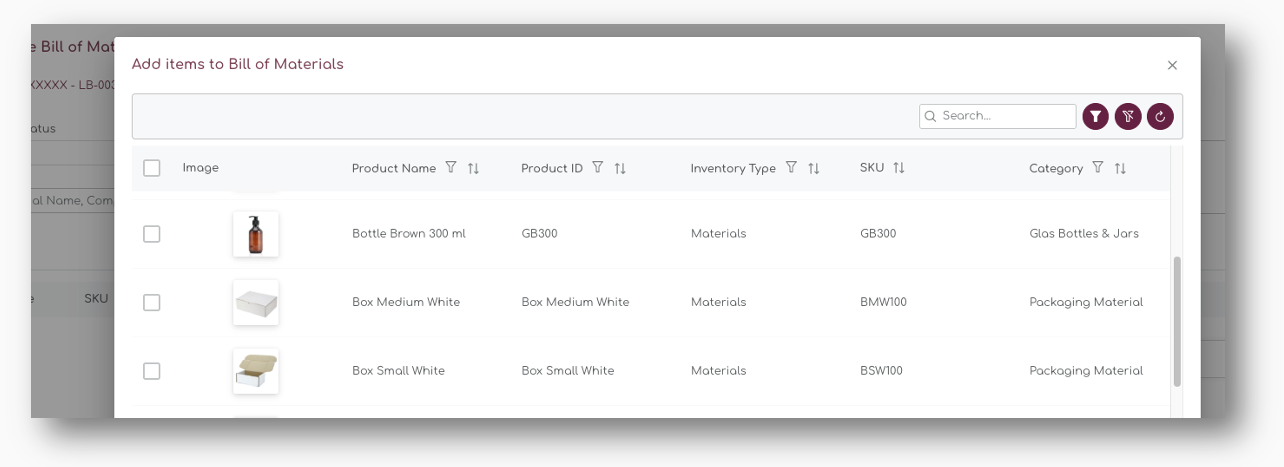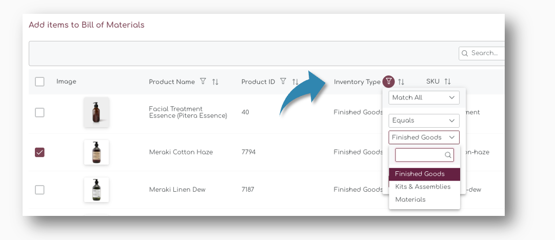 Kits & Assemblies can be created by mixing both Materials, Finished Goods, or other assebled parts. When you create a new kit, you can easily filter on the 'Inventory Type' and select the type of product you want to add:
