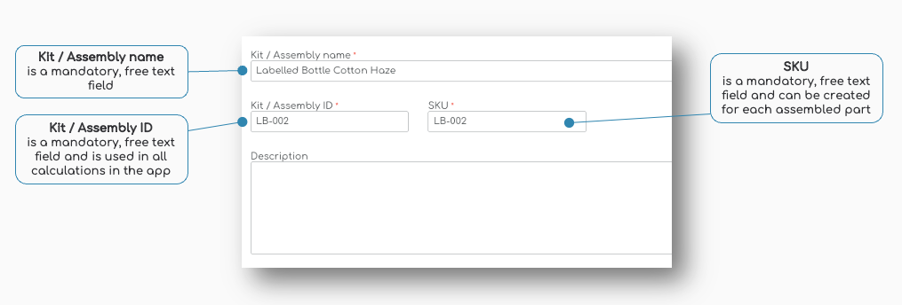 A pop up appears where you can you can enter the details of the new Kit. The first section is the general material information. This is where you can add all generic information such as name, ID and SKU number. You can also add some general comments or descriptions.